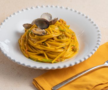 Main Courses Spaghetti with clams, zucchini flowers, and saffron Spaghetti with clams, zucchini flowers, and saffron are perfect for a seafood menu: a tasty and flavorful recipe, guaranteed to be a success! Easy 30 min READ RECIPE