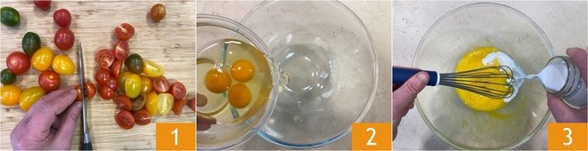 To prepare the 12-spoon savory cake with cherry tomatoes and olives, first wash the cherry tomatoes and cut them in half 1. Crack the eggs into a large bowl 2. Beat them with a whisk by hand until you obtain a homogeneous mixture, then pour in the milk in a thin stream while continuing to stir 3.