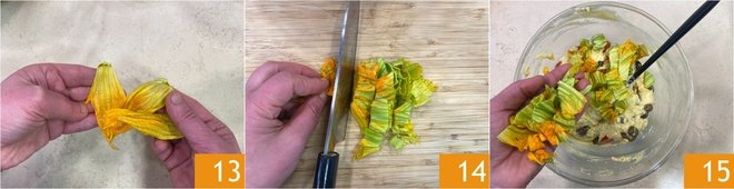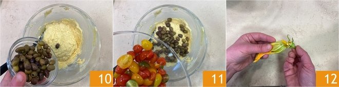 Stir carefully until you obtain a smooth, soft batter free of lumps, then add the pitted olives 10 and a good portion of the cherry tomatoes 11. Reserve about ten for the final decoration. Gently clean the zucchini flowers, removing the internal pistil 12.