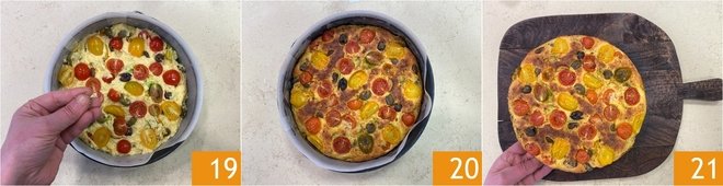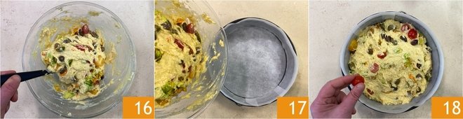 Mix well to evenly distribute all the ingredients 16. Line a 9.5-inch (24 cm) diameter cake pan with parchment paper and pour in the mixture 17. Level the surface with the back of a spoon, then decorate with the reserved cherry tomatoes 18.
