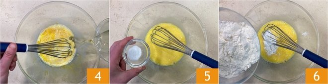 Add the oil in a thin stream while continuing to whisk 4; add the salt 5 and the sifted flour 6.