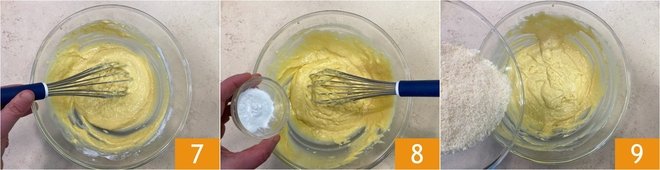 Mix with a whisk 7, then also add the sifted baking powder 8 and the grated Grana cheese 9.