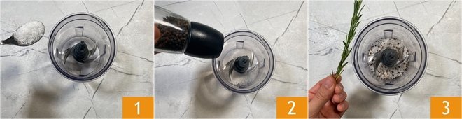 To prepare the chicken thighs in the air fryer, first make the seasoned salt: in a mixer, add the coarse salt 1, black pepper 2, and rosemary leaves 3.