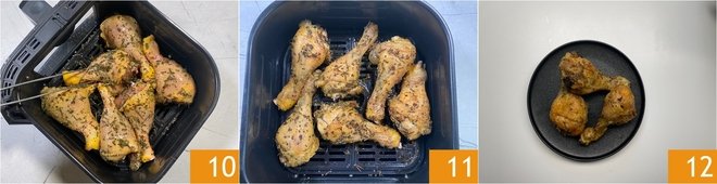 Place the thighs in the air fryer basket without overlapping them (we used an air fryer with a capacity of about 6 liters) 10. Cook at 375°F for 35 minutes until they are well browned 11. To check if they are done, prick the thighs with a fork: if the liquid that comes out is clear, they are well cooked but still moist. If the liquid is pink, they need a few more minutes of cooking. Serve your air fryer chicken thighs immediately 12!