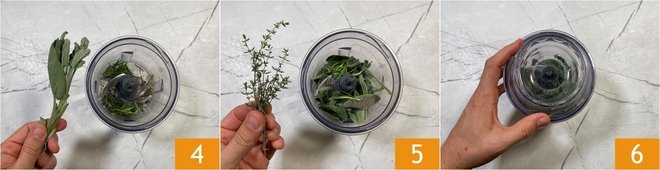 Add the sage leaves 4 and thyme leaves 5. Blend everything until you get a fairly fine, homogeneous mixture 6.