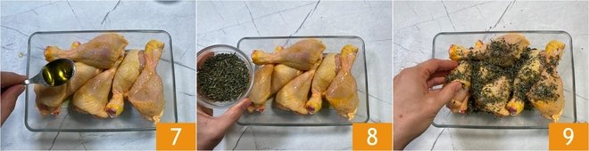 Place the thighs in a baking dish, spread the skin well and oil it 7, then sprinkle with the seasoned salt 8 and massage to flavor the meat evenly 9.