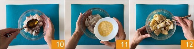 Transfer half of the squids into a bowl and season them with a little oil 10. Mix well and then add half of the cornmeal 11. Mix again, until all the squids are breaded 12. Distribute the breaded squid rings in the basket of the air fryer, spray them with a little oil on the surface and cook at 390°F (200°C) for 13 minutes. After 7 minutes, shake the basket and continue cooking for another 6 minutes or until you get nice golden squid rings on the surface. Meanwhile, repeat the operation with the other 4 squids.