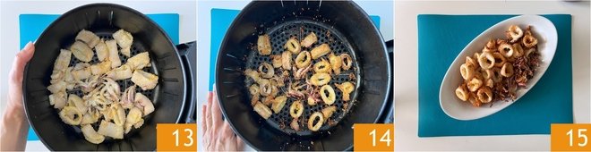 Distribute the breaded squid rings in the basket of the air fryer 13, we used a 7 liter one. It is important not to overlap the squid. Sprinkle the surface with a little oil and cook at 390°F (200°C) for 13 minutes. After 7 minutes, shake the basket and continue cooking for another 6 minutes or until you get nice golden squid rings on the surface 14. In the meantime, also panate the other squids and cook them in the same way. Serve the air fryer calamari hot 15.