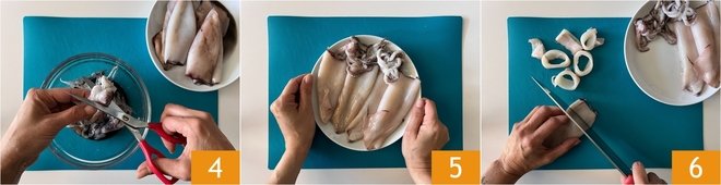 Take back the tentacles, cut the part of the eyes 4 and remove the beak that is in the center. Continue in this way until all the squids are cleaned 5. Rinse them and cut the squid into 2 cm rings 6. If the tentacles are large, cut them in half. Once cleaned you will get 1.33 lbs (620 g).