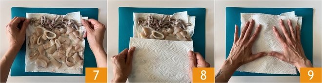 Transfer the squids onto some sheets of kitchen paper 7, place another one on top 8 and dry them well 9.