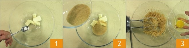 To prepare almond drop cookies, first ensure that the ingredients are at room temperature. In a bowl, combine the softened butter with the salt 1 and brown sugar 2, and work for a couple of minutes with electric beaters, then add the egg 3 and mix for another minute.