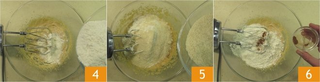 Now add the all-purpose flour 4, almond flour 5, and cinnamon 6.