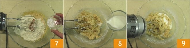 Also add the baking powder 7 and, while mixing everything with the beaters, gradually pour in the milk 8. Continue working 9 until you obtain a homogeneous mixture.
