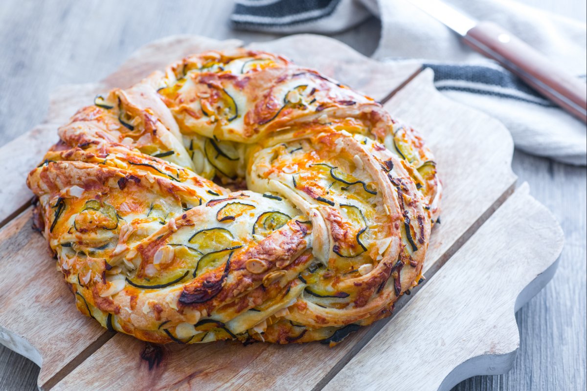 Angelica brioche with zucchini is a show-stopping soft, savory, leavened brioche. It is inspired by the iconic Italian Angelica cake recipe, which is stuffed with chocolate chips, and topped with a sweet glaze! In this savory version, the chocolate chips are replaced by soft zucchini, tasty caciocavallo cheese, and crunchy slivers of toasted almonds. The method and the final wreath construction are unchanged, and you will get the same show-stopping effect… a savory cake that is a feast for the eyes! Angelica brioche with zucchini is perfect to serve as an appetizer with pride of place on your table, or to take on a picnic: it is excellent whether eaten hot or at room temperature. Try it in our mignon version, or with beer!