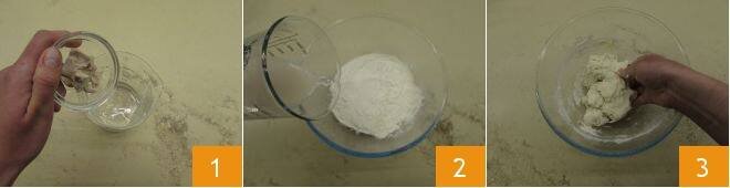 To make Angelica brioche with zucchini, firstly make a pre-ferment or biga: dissolve the brewer’s yeast in the water 1, transfer it to a bowl containing the flour 2 and begin to knead with your hands 3.