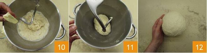 As soon as the mixture is uniform, start to add the softened butter, a small piece at a time 10. Knead until everything is completely absorbed 11, then add the salt. Transfer the dough to a work surface and knead for a few seconds by hand 12,