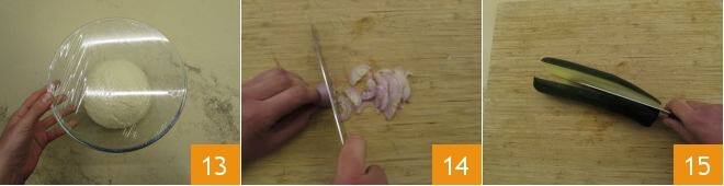 then form a ball and place it in a bowl. Cover with plastic wrap 13 and leave to rise for 2 hours at room temperature or in an unheated oven with the light on. Meanwhile, make the filling: peel the shallot and cut into thin slices 14. Top and tail the zucchini and make the first cut lengthwise 15,