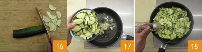 then slice them into half-moons 16. Pour a little oil into a pan, add the shallot, and allow to soften. Then add the zucchini 17 and season with salt and pepper 18.