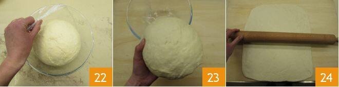 As soon as the dough has risen 22, transfer it to the work surface 23 and roll it out with a rolling pin to a 20x14 inch (50x35 cm) rectangle that is approximately 0.15 inch (4 mm) thick 24.