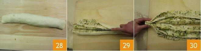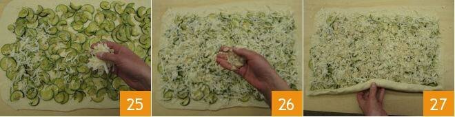 Cover the entire surface with the zucchini, grated cheese 25, and almond flakes 26. Roll up, starting from the long side 27 and taking care not to let the filling emerge. Seal the edges well and leave to set in the refrigerator for 30 minutes.