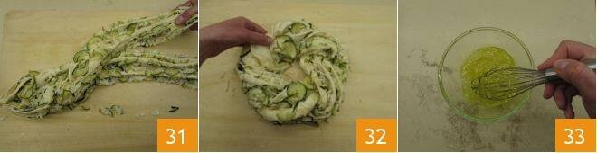 then braid the two strands, keeping the cut side uppermost so that the filling is visible 31. Lastly, join both ends to form a wreath 32 and transfer it gently to a baking pan lined with parchment paper. Emulsify the water and oil with a whisk 33
