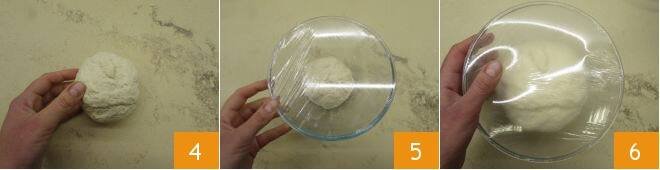 Transfer the mixture to a work surface, shape into a ball and put back into the bowl 4. Cover with plastic wrap 5 and leave to rise for an hour at 80°F (26°C) or in an unheated oven with the light on. Once it has doubled in size 6, you can make the dough.