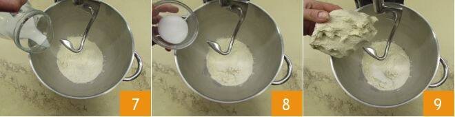 Pour the flour and milk into the bowl 7 of a planetary mixer fitted with a dough hook attachment, then add the sugar 8 and pre-ferment 9 and start to knead everything.