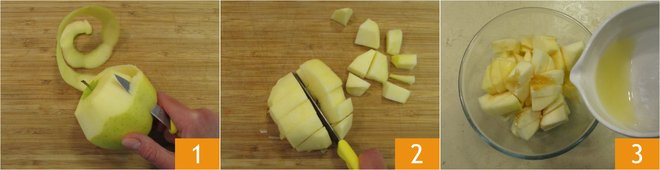 To prepare the apple cake without butter, first peel 1.1 lbs of apples for the batter 1, remove the core. You will have 0.8 lbs of pulp to cut into pieces 2. Transfer to a bowl and drizzle with lemon juice to prevent the apple from browning 3.