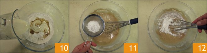 Gradually add the plant-based milk 10 while you start mixing with the whisk. Sift in the baking powder 11 and blend it well into the batter 12.