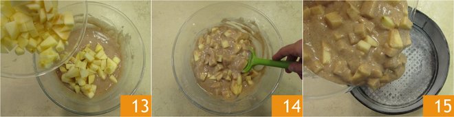 Lastly, add the diced apples (drained from the lemon juice) 13, incorporating them into the mixture with a spatula 14. Pour the batter into a greased and floured 9-inch diameter cake pan 15.