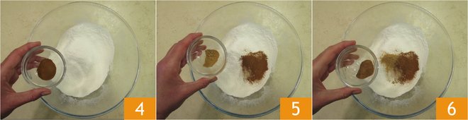 Sift the flour into a bowl, then add the ground cinnamon 4, ground ginger 5, and ground nutmeg 6.