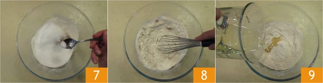Add the sugar and salt 7, then mix the dry ingredients with a whisk 8. Pour in the seed oil 9.