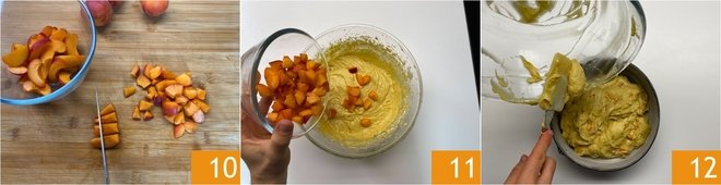 Cut the remaining apricots into cubes 10 and immerse them in the batter 11. Transfer the mixture into a 20 cm (7 7/8 inches) buttered and floured mold 12.