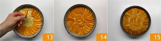 Arrange the apricot slices on the surface 13 to create a sunburst pattern 14 and bake in a preheated static oven at 340°F for about 70 minutes. The apricot and ricotta cake is ready 15, let it cool slightly, then remove it from the mold and serve it dusted with powdered sugar.