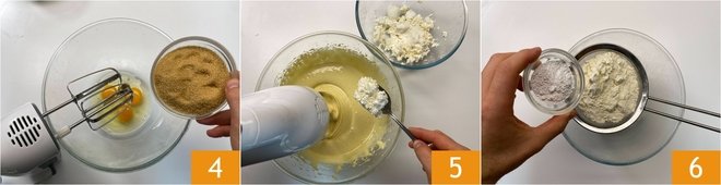 Beat the eggs with electric beaters at medium-high speed, gradually adding the sugar 4. This will take about 10 minutes. Once you have a light and frothy mixture, incorporate the ricotta, one tablespoon at a time 5. Sift the flour and baking powder separately 6,