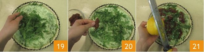 Now spread most of the fresh arugula on the bottom of the tart pan 16, pour the cream on top 17, and spread it evenly with the back of a spoon 18.