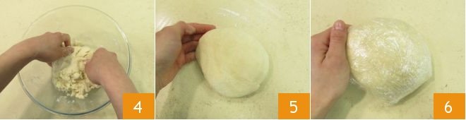 and knead 4 until you get a compact and homogeneous dough. Form a block 5, wrap it in plastic wrap 6 and let it rest in the refrigerator for at least 40 minutes.