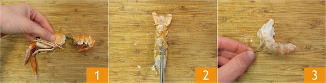 To prepare the asparagus and scampi risotto, start by cleaning the : detach the head from the body 1 and set it aside, then use scissors to open the tail 2 and extract the prawn meat, saving the tail with the head. Remove the intestine by pulling it with your fingers 3 or using a toothpick.
