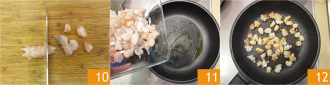 Cut the scampi into pieces about 1 cm 10. Sauté them briefly in a non-stick pan over high heat 11 and then set them aside 12.
