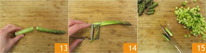 Clean the asparagus, remove the hard part of the stalk 13 and peel the rest of the stem with a vegetable peeler, leaving the tip intact 14. Cut into slices about 2 mm thick and halve the tips 15.