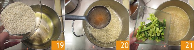 Keeping the heat on medium, add the rice 19 and toast it for a few moments, then deglaze with a ladle of broth 20. Continue cooking using the broth to moisten the rice and after about 5 minutes, add the asparagus 21 (saving some for plate decoration).