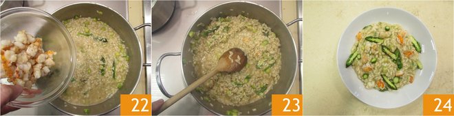 Salt, pepper, and continue cooking until the rice is ready. At this point, turn off the heat, add the scampi 22 (saving some for plate decoration) and stir in the oil 23. If needed for stirring, you can add a little broth. Adjust salt and pepper, and your risotto is ready to be served, decorated with asparagus and scampi set aside, and a grind of pepper. Serve the asparagus and prawn risotto hot 24.