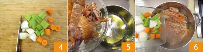 Now prepare the broth: cut the vegetables into irregular chunks 4, heat a pot very well over high heat, add a drizzle of oil and add the shells 5 and vegetables 6.