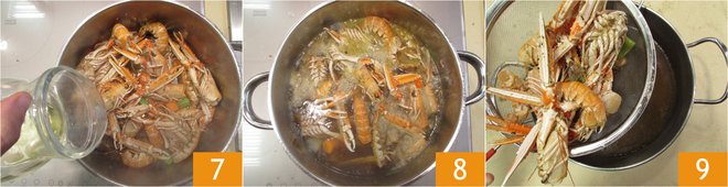Sauté over high heat for about 5 minutes. When the shells have taken on a bright color, deglaze with white wine 7 and let it evaporate, then add water to cover and let it simmer for about 10 minutes 8. Once done, strain the broth through a fine-mesh sieve into another small pot 9 and keep it over low heat, as it will be used for cooking the risotto.