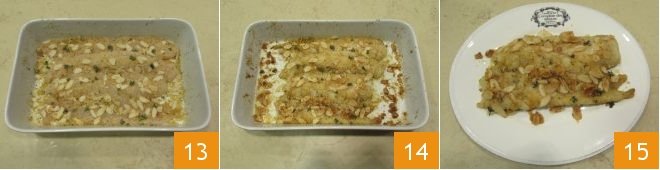 Add the rest of the breading 13 and proceed with cooking: bake the fillets in a preheated static oven at 390°F for 15-20 minutes or until the fillets form a crispy crust on the surface. Once cooked, remove the baking dish from the oven 14 and serve the baked cod fillets hot 15.