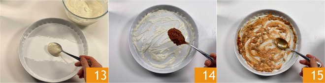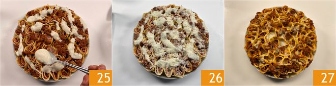 In a round baking dish with a diameter of 12 inches, pour a layer of béchamel 13 and one of meat sauce 14, mix to combine 15.