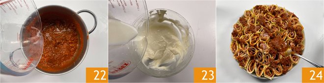 Now thin the remaining meat sauce 22 and béchamel 23 with a little water. Distribute the meat sauce over the rolls 24.