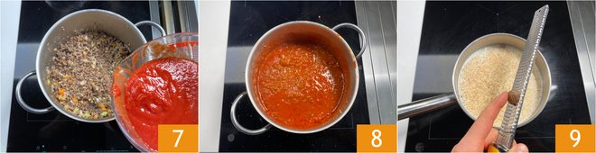 Pour in the tomato puree 7 and thin it with a little water, just enough to slightly extend the sauce. Salt and cook for 40 minutes on low heat 8. Meanwhile, prepare the béchamel: heat the milk in a saucepan with nutmeg 9.