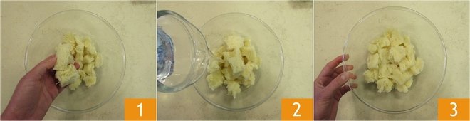 To prepare the baked meatballs, first transfer the stale breadcrumbs into a bowl 1. Add water to cover it 2 and let it soak for a few minutes 3.