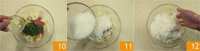Now add the previously chopped garlic and parsley 10, the grated Parmigiano Reggiano and Pecorino 11. Knead well with your hands 12.